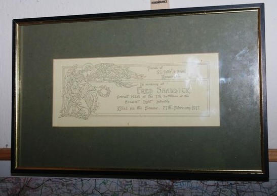 PARISH OF/ SS. PETER & PAUL/ RUNNINGTON/ IN MEMORY OF/ FRED SHADDICK/ PRIVATE 32201 OF THE 7TH BATTALION OF THE/ SOMERSET LIGHT INFANTRY KILLED ON THE SOMME, 27TH FEBRUARY 1917