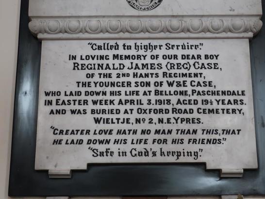 CALLED TO HIGHER SERVICE / IN LOVING MEMORY OF OUR DEAR BOY / REGINALD JAMES (REG) CASE / OF THE 2ND HANTS REGIMENT / THE YOUNGER SON OF W&E CASE, WHO LAID DOWN HIS LIFE AT BELLONE PASCHENDALE / IN EASTER WEEK APRIL 3 1918 AGED 19 1/2 YEARS / AND WAS BURIED AT OXFORD ROAD CEMETERY / WIELTJE NO. 2 N E YPRES / GREATER LOVE HATH NO MAN THAN THIS THAT / HE LAID DOWN HIS LIFE FOR HIS FRIENDS / SAFE IN GOD’S KEEPING