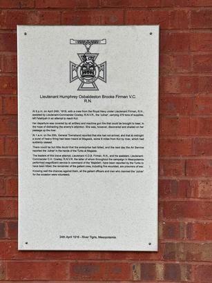 New Plaque-Lieutenant Humphrey Osbaldeston Firman V.C./R.N./At 6 p.m. on April 24th 1918 , with a crew from the Royal Navy under Lieutenant Pitman, R.N./assisted by Lieutenant-Commander Cowley, R.N.V.R. , the 'Jutnar', carrying 270 tons of supplies, /left Falaiyah in an attempt to reach Kut.//Her departure was covered by all artillery and machine gun fire that could be brought to bear, in/the hope of distracting the enemy's attention. She was, however, discovered and shelled on her/passage up the river.// At 1 a.m. on the 25th, General Townshend reported that she had not arrived, and that at midnight/a burst of heavy firing had been heard at Magasis, some 9 miles from Kut by river, which had/suddenly ceased.// There could be but little doubt that the enterprise had failed, and the next day the Air Service/reported the 'Julnar' in the hands of the Turks at Magasis.// The leaders of this brave attempt, Lieutenant H.O.B. Firman, R.N., and his assistant, Lieutenant-/Commander C.H. Cowley, R.N.V.R. the latter of whom throughout the campaign in Mesopotamia/performed magnificent service in command of the 'Mejideh', have been reported by the Turks to/have been killed, the remainder of the gallant crew, including five wounded, are prisoners of war.// Knowing well the chances against them, all the gallant officers and men who manned the 'Julnar'/for the occasion were/for the occasion were volunteers.; Plaque on the Cenotaph- 1914-1918/Lieutenant H.O.B. Firman VC/SS "Julnar", Royal Navy/Died age 29 on 24 April 1916