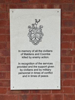 In memory of all/the civilians/of Maldens and Coombe/killed by enemy action.//In recognition of the services/provided and the support given/by civilians and by military/personnel in times of conflict/and in times of peace
