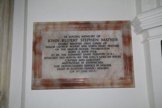 IN LOVING MEMORY OF/ JOHN RUPERT STEPHEN MATHER/ DEARLY BELOVED ONLY CHILD OF/ MAJOR GEORGE RUPERT AND EDITH MARY MATHER/ OF THE MANOR HOUSE, THURLOXTON/ BORN 12 JUNE 1928/ 1ST BN THE SOMERSET LIGHT INFANTRY (P.A.)/ ATTACHED 3RD (KENYA) BN. THE KING'S AFRICAN RIFLES/ CAPTAIN AND ADJUTANT/ MENTIONED IN DESPATCHES/ FOR DISTINGUISHED SERVICE IN MALAY/ KILLED AT KUANTAN, PAHANG, MALAYA/ ON 27TH JUNE 1953