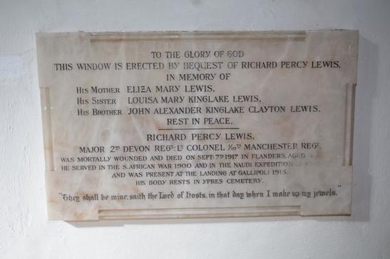 TO THE GLORY OF GOD/ THIS WINDOW IS ERECTED BY BEQUEST OF RICHARD PERCY LEWIS/ IN MEMORY OF/ HIS MOTHER, SISTER, BROTHER (NAMES) / RICHARD PERCY LEWIS, MAJOR 2ND DEVON RGT, LT COL 10TH MANCHESTER RGT,/ WAS MORTALLY WOUNDED AND DIED ON SEPT 7TH 1917 IN FLANDERS AGED 43./ HE SERVED IN THE SOUTH AFRICAN WAR 1900 AND IN THE NAUDI EXPEDITION 1905 - 06/ AND WAS PRESENT AT THE LANDING AT GALLIPOLI 1915./ HIS BODY REST IN YPRES CEMETERY./ "THEY SHALL BE MINE, SAITH THE LORD OF HOSTS, IN THAT DAY WHEN I MAKE UP MY JEWELS"