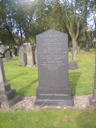 In/Loving Memory/Of/EMMELINE/THE BELOVED WIFE OF/BENJAMIN CORFIELD/.../ALSO/PTE FRED CORFIELD/KILLED IN FRANCE SEPTEMBER 1917,/AGED 23 YEARS/...