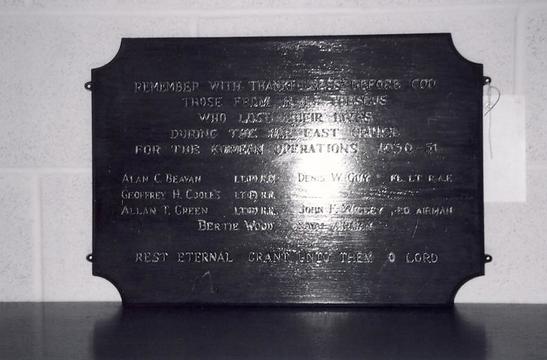 REMEMBER WITH THANKFULNESS BEFORE GOD/ THOSE FROM H.M.S. THESEUS/ WHO LOST THEIR LIVES/ DURING THE FAR EAST CRUISE/ FOR THE KOREAN OPERATIONS 1950-51./ (Names)/ REST ETERNAL GRANT UNTO THEM O LORD.