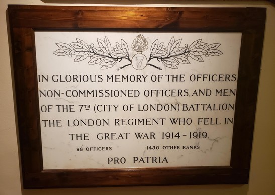 In Glorious Memory of the Officers, Non-Commissioned Officers, and Men of The 7th (City of London) Battalion The London Regiment Who Fell in The Great War 1914-1919 88 Officers 1430 Other Ranks Pro Patria