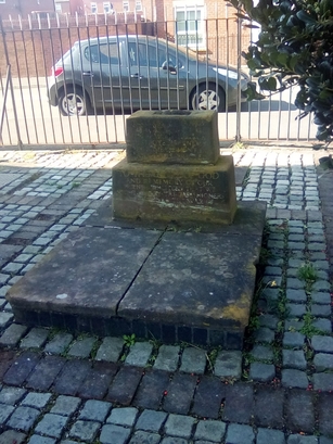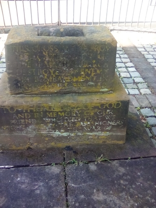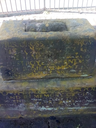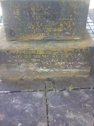 THIS CROSS MADE FROM/ THE GATEPOSTS OF/ THE PARISH CHURCH/ DESTROYED BY ENEMY/ AIR BOMBARDMENT IN/ MAY 1941 WAS ERECTED/ TO THE GLORY OF GOD/ AND IN MEMORY OF OUR/ FRIENDS WHO DIED THAT WE/ MIGHT LIVE BY THE PARISHIONERS/ WHO SURVIVED THE WAR OF/ 1939-1945