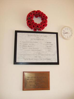 WW1 - TO THE GLORY OF GOD / AND / IN MEMORY OF / (5 NAMES) / OF THIS PARISH / WHO GAVE THEIR LIVES FOR KING AND COVNTRY IN THE GREAT WAR / 1914 - 1919 / " THEIR NAME LIVETH FOR EVERMORE " WW2 - ALSO / (2 NAMES) / WHO GAVE THEIR LIVES / IN THE / SECOND WORLD WAR / 1939 - 1945