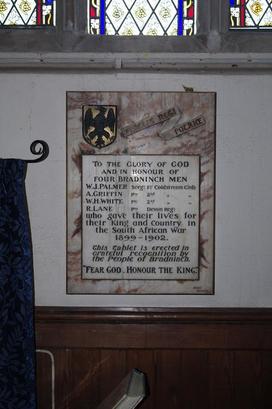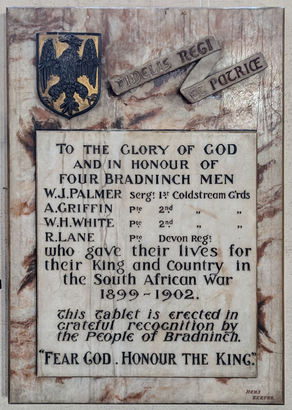 FIDELIS REGI PATRICE / TO THE GLORY OF GOD / AND IN HONOUR OF / FOUR BRADNINCH MEN / (4 NAMES) / who gave their lives for / their King and Country in / the South African War / 1899 - 1902. / This Tablet is erected in / Grateful recognition by / the people of Bradninch. / "FEAR GOD. HONOUR THE KING."