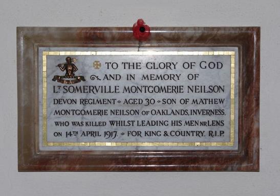 TO THE GLORY OF GOD/ AND IN MEMORY/ OF LT. SOMERVILLE MONTGOMERIE NEILSON/ DEVON REGIMENT AGED 30. SON OF MATTHEW/ MONTGOMERIE NEILSON OF OAKLANDS INVERNESS/ WHO WAS KILLED WHILST LEADING HIS MEN NR. LENS/ ON 14TH APRIL 1917 FOR KING AND COUNTRY, R. I. P.