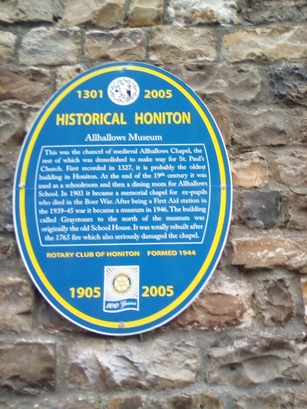 1301 2005/HISTORICAL HONITON/Allhallows Museum/This was the chancel of medieval Allhallows Chapel, the/rest of which was demolished to make way for St Paul's/Church. First recorded in 1327, it is probably the oldest/building in Honiton. At the end of the 19th century it was/used as a schoolroom and then a dining room for Allhallows/School. In 1903 it became a memorial chapel for ex-pupils/who died in the Boer War. After being a First Aid station in the 1939-45 war it became a museum in 1946. The building called Graystones to the north of the museum was/originally the old School House. It was totally rebuilt after/the 1765 fire which also seriously damaged the chapel./ ROTARY CLUB OF HONITON FORMED 1944/1905 [rotary club badge] 2005
