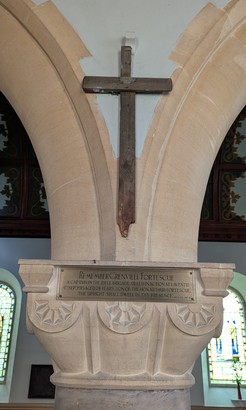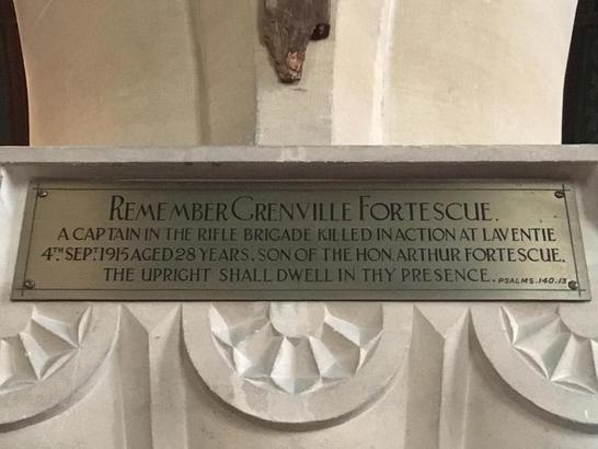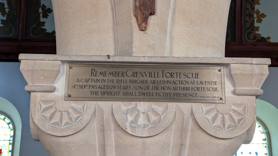 Battlefield Cross . The information on the GRU tags and white metal strips is impossible to read . Brass Plaque below the Battlefield Cross / REMEMBER GRENVILLE FORTESCUE / A CAPTAIN IN THE RIFLE BRIGADE KILLED IN ACTION AT LAVENTIE / 4TH. SEPT. 1915 AGED 28 YEARS. SON OF THE HON ARTHUR FORTESCUE. / THE UPRIGHT SHALL DWELL IN THY PRESENCE. / PSALMS. 140.13