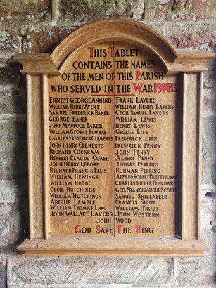THIS TABLET / CONTAINS THE NAMES / OF THE MEN OF THIS PARISH / WHO SERVED IN THE WAR 1914 - 19 / (NAMES) / GOD SAVE THE KING