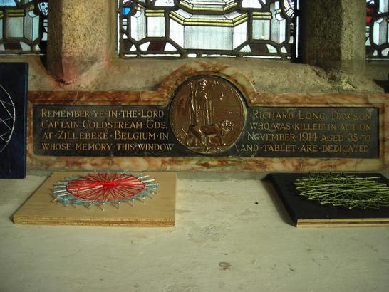 TABLET: REMEMBER YE IN THE LORD RICHARD LONG DAWSON. CAPTAIN COLDSTREAM GDS WHO WAS KILLED IN ACTION/ AT ZILLEBEKE BELGIUM NOVEMER 1914 AGED 35 TO/ WHOSE MEMORY THIS WINDOW AND TABLET ARE DEDICATED WINDOW, LEFT LIGHT: BENEDICTE ANGELI DOMINI DOMINUM/ S GARIEL ARCHANGELUS CENTRE LIGHT: S MICHAEL PRINCEPS ANG WINDOW RIGHT LIGHT: GRADUATE SUPER EXALTATERTUM (...)/ S RAPHAEL ARCHANGELO