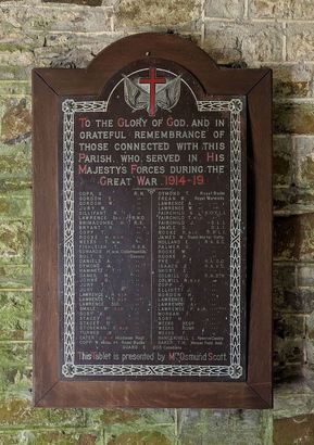 TO THE GLORY OF GOD, AND IN / GRATEFUL REMEMBRANCE OF / THOSE CONNECTED WITH THIS / PARISH WHO SERVED IN HIS / MAJESTY'S FORCES DURING THE / GREAT WAR 1914-19. / (65 NAMES) / This Tablet is presented by Mrs Osmund Scott