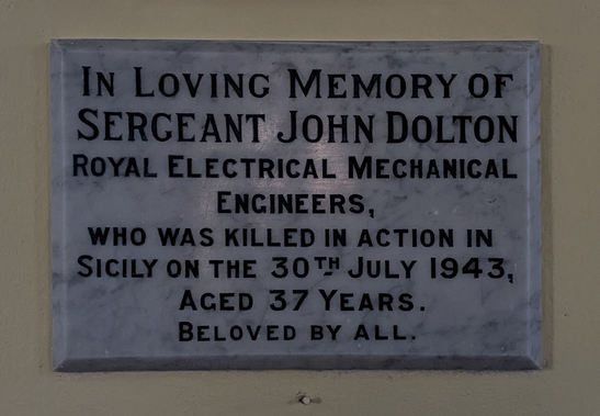 IN LOVING MEMORY OF / SERGEANT JOHN DOLTON / ROYAL ELECTRICAL MECHANICAL / ENGINEERS, / WHO WAS KILLED IN ACTION IN / SICILY ON THE 30TH JULY 1943, / AGED 37 YEARS. / BELOVED BY ALL.