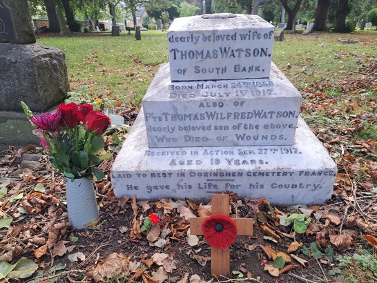 ... Also of Pte Thomas Wilfred Watson dearly beloved son of the above who died of wounds received in action Sep. 27th 1917. Aged 19 years. Laid to rest in Dozinghem cemetery France He gave his life for his country