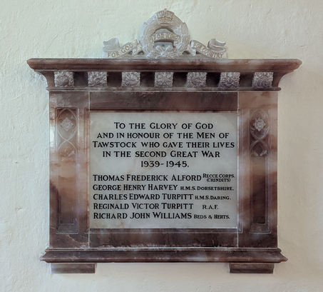 (top inscription): FOR GOD FOR KING FOR COUNTRY / (main face): TO THE GLORY OF GOD / AND IN HONOUR OF THE MEN OF / TAWSTOCK WHO GAVE THEIR LIVES / IN THE SECOND GREAT WAR / 1939 - 1945. / (5 NAMES)