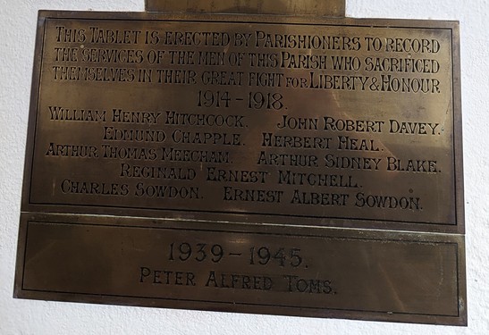 Upper plaque : THIS TABLET IS ERECTED BY PARISHIONERS TO RECORD / THE SERVICES OF THE MEN OF THIS PARISH WHO SACRIFICED / THEMSELVES IN THEIR GREAT FIGHT FOR LIBERTY & HONOUR / 1914 - 1918 / (9 NAMES) / Lower extension plaque : 1939 - 1945 / (1 NAME)