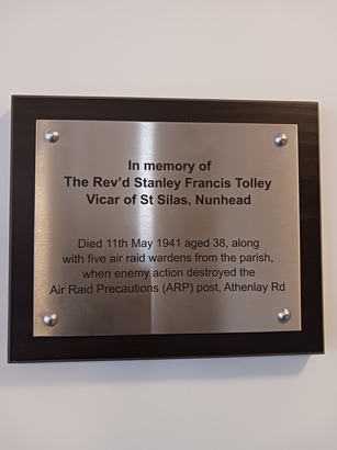 In memory of The Rev'd Stanley Francis Tolley Vicar of St. Silas Nunhead Died 11th May 1941 aged 38, along with five air raid wardens from the parish when enemy action destroyed the Air Raid Precautions (ARP) post, Athenlay Road