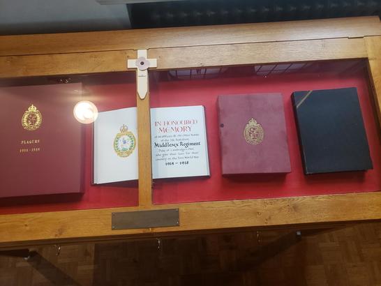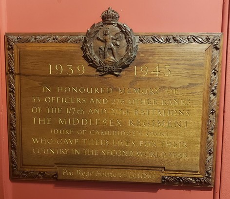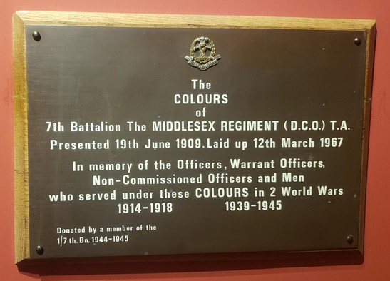 In Honoured Memory of 66 Officers and 792 other ranks of the 7th Battalion, Middlesex Regiment (Duke of Cambridge's Own) who gave their lives for their country in the First World War 1914-1918. In Honoured Memory of 33 Officers and 276 other ranks of the 1/7th and 2/7th Battalions, The Middlesex Regiment (Duke of Cambridge's Own) who gave their lives for their country in the Second World War 1914-1918.