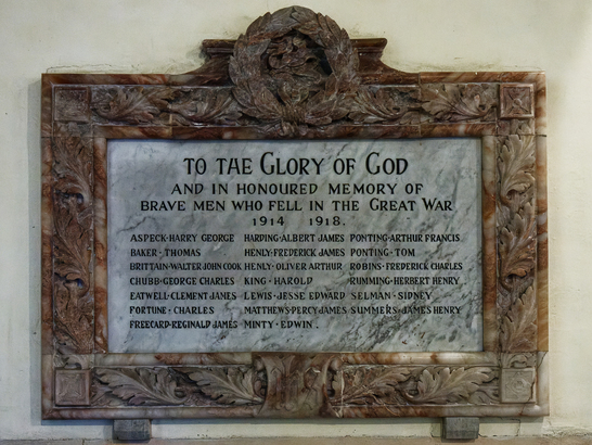 TO THE GLORY OF GOD/AND IN HONOURED MEMORY OF/BRAVE MEN WHO FELL IN THE GREAT WAR/1914 1918./(Names)