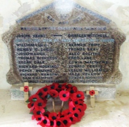 In honoured memory of the men of this church/ who fell in the Great War 1914 - 1918/ (Names)/ Also of the men of this village who served/ (Names).