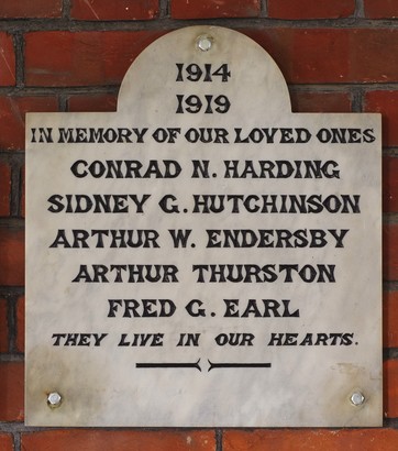 1914 1919 IN MEMORY OF OUR LOVED ONES CONRAD N. HARDING SIDNEY G. HUTCHINSON ARTHUR W. ENDERSBY ARTHUR THURSTON FRED G. EARL THEY LIVE IN OUR HEARTS