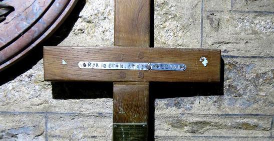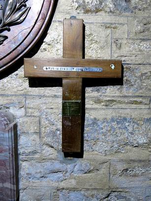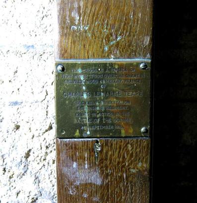 METAL TAG: 2/LIEUT C L TEAPE DEVONS PLAQUE: THIS CROSS IS A REPLICA OF/ THAT WHICH STOOD OVER THE GRAVE IN/ DELVILLE WOOD CEMETERY, FRANCE/ OF/ CHARLES LEWARNE TEAPE/ SEC. LT. 9TH BATTALION/ DEVONSHIRE REGIMENT/ KILLED IN ACTION IN THE/ BATTLE OF THE SOMME/ 4TH SEPT 1916