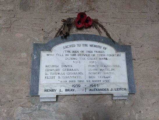 SACRED TO THE MEMORY OF/ THE MEN OF THIS PARISH/ WHO FELL IN THE SERVICE/ OF THEIR COUNTRY/ DURING THE GREAT WARS/ 1914 - 1919./ (NAMES)/ 1939 - 1945./ (NAMES)