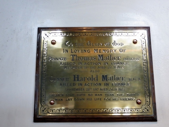 TO THE GLORY OF GOD/ IN LOVING MEMORY OF/ PRIVATE THOMAS MATHER BORDER RGT/ KILLED IN ACTION IN FRANCE/ DECEMBER 14TH 1915 AGED 22 YEARS/ ALSO/ GUNNER HAROLD MATHER R.G.A./ KILLED IN ACTION IN FRANCE/ SEPTEMBER 28TH 1917 AGED 28 YEARS/ GREATER LOVE HATH NO MAN THAN THIS THAT A/ MAN LAY DOWN HIS LIFE FOR HIS FRIENDS.