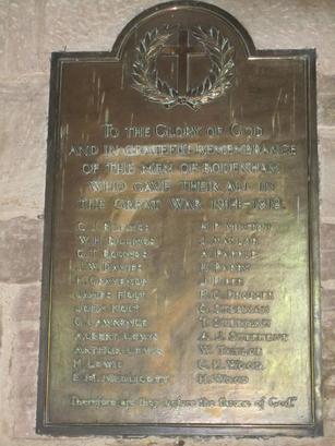 TO THE GLORY OF GOD/ AND IN GRATEFUL REMEMBRANCE/ OF THE MEN OF BODENHAM/ WHO GAVE THEIR ALL IN/ THE GREAT WAR 1914-1919/ "Therefore are they before the throne of God."