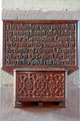 THIS ALMS BOX WAS PROVIDED/ BY MONEY FOUND ON CEDRIC/ FOSTER, GRENADIER GUARDS/ WHO, MORTALLY WOUNDED AT/ THE BATTLE OF NEUVE CHAPELLE/ MARCH 11 1915, DIED THE NEXT/ DAY IN HOSPITAL AT MERVILLE