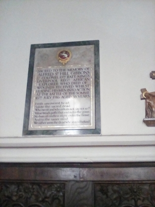 SACRED TO THE MEMORY OF/ALFRED ST HILL GIBBONS/LT COLONEL 13TH BATT. KING'S/LIVERPOOL REGT AFRICAN/EXPLORER WHO DIED OF/WOUNDS RECEIVED WHILST/LEADING HIS MEN INTO ACTION/AT THE BATTLE OF THE SOMME/16TH JULY 1916 AGED 58 YEARS/..