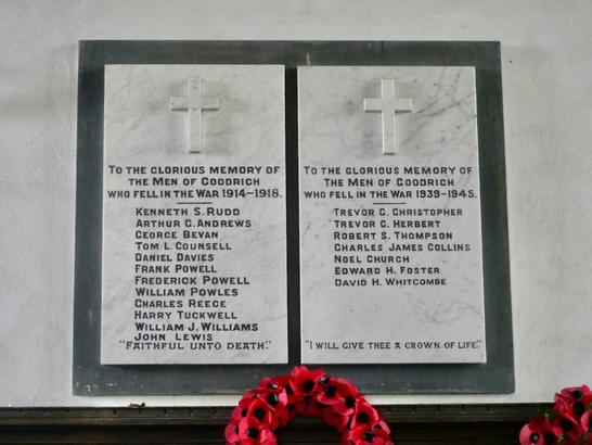LEFT TABLET: TO THE GLORIOUS MEMORY OF/ THE MEN OF GOODRICH/ WHO FELL IN THE WAR 1914 - 1918./ (NAMES)/ "FAITHFUL UNTO DEATH" RIGHT TABLET: TO THE GLORIOUS MEMORY OF/ THE MEN OF GOODRICH/ WHO FELL IN THE WAR 1939 - 1945./ (NAMES)/ "I WILL GIVE THEE A CROWN OF LIFE"