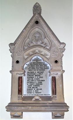 IN/ LOVING/ REMEMBRANCE/ OF/ THE MEN ASSOCIATED/ WITH THIS CHURCH WHO DURING/ THE GREAT WAR 1914 - 1919./ LEFT ALL THAT WAS DEAR TO THEM,/ AND GAVE THIER LIVES THAT OTHERS/ MIGHT LIVE IN FREEDOM/ ...(NAMES)/ "THESE ARE THEY WHO CAME OUT OF GREAT TRIBULATION"