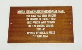 MUCH DEWCHURCH MEMORIAL HALL/ THIS HALL HAS BEEN ERECTED/ IN HONOUR OF THOSE FROM/ THIS PARISH WHO SERVED/ IN H.M. FORCES DURING/ 1939-45/ OPENED BY REV. L. G. MOSS/ 1ST JUNE 1974
