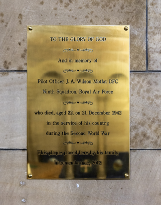 TO TTHE GLORY OF GOD And in memory of> Pilot Officer J. A. Wilson Moffat DFC> Ninth Squadron, Royal Air Force> who died, aged 22, on 21 December 1942> in the service of his country,> during the Second World War. This plaque was placed here by his family, > in remembrance, 2012