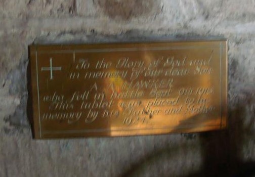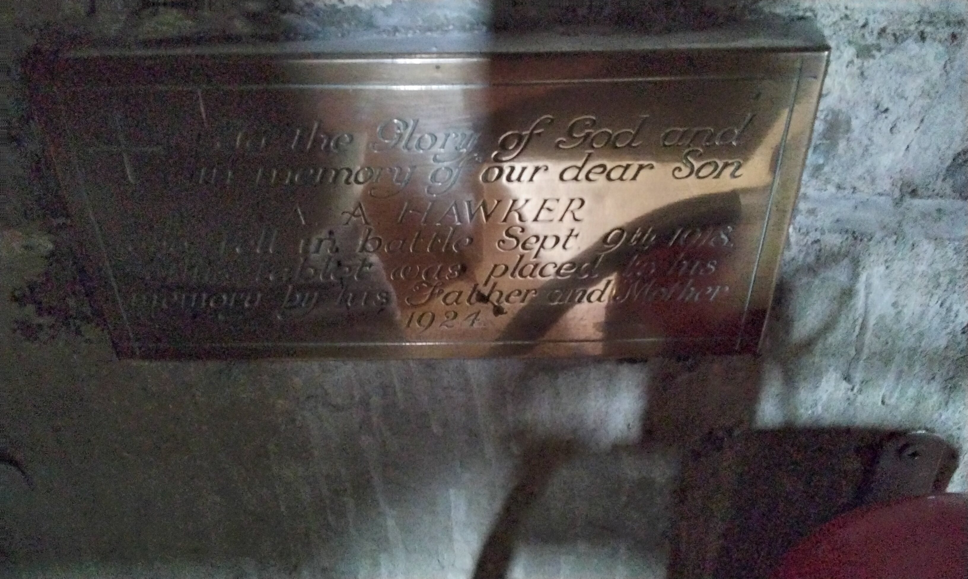 TO THE GLORY OF GOD AND/ IN MEMORY OF OUR DEAR SON/ A. A. HAWKER/ WHO FELL IN BATTLE SEPT. 9TH 1918./ THIS TABLET WAS PLACED TO HIS/ MEMORY BY HIS FATHER AND MOTHER/ 1924