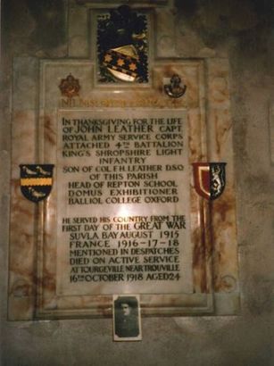 NILNISI OVOD HONESTUM/ IN THANKSGIVING FOR THE LIFE/ OF JOHN LEATHER CAPT/ ROYAL ARMY SERVICE CORPS/ ATTACHED 4TH BATTALION/ KING'S SHROPSHIRE LIGHT/ INFANTRY/ SON OF COL. E. H. LEATHER D.S.O./ OF THIS PARISH/ HEAD OF REPTON SCHOOL/ DOMUS EXHIBITIONER/ BALLIOL COLLEGE OXFORD/ HE SERVED HIS COUNTRY FROM THE/ FIRST DAY OF THE GREAT WAR/ SUVLA BAY AUGUST 1915/ FRANCE 1916 - 17 - 18/ MENTIONED IN DESPATCHES/ DIED ON ACTIVE SERVICE/ AT TOURGEVILLE NEAR TROUVILLE/ 16TH OCTOBER 1918 AGED 24