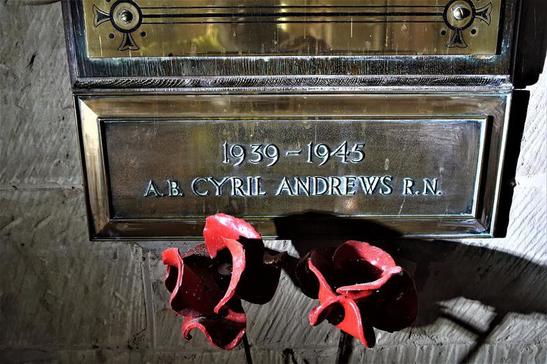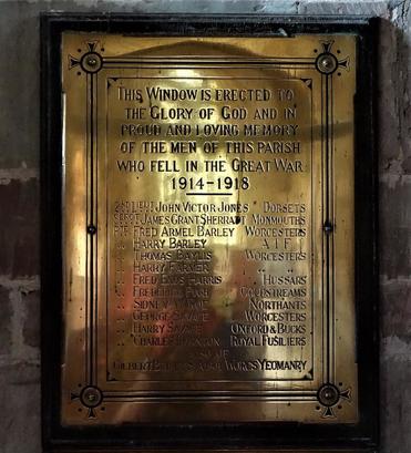 THIS WINDOW IS ERECTED TO / THE GLORY OF GOD IN / PROUD AND LOVING MEMORY / OF THE MEN OF THIS PARISH / WHO FELL IN THE GREAT WAR / 1914 - 1918 / (NAMES) / ALSO OF / (NAME) // Lower plaque: 1939 - 1945 / (1 NAME)