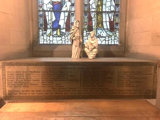 OBEDIENTES USQUE AD MORTEM/ (Names)/ THIS TABLET RECORDS THE NAMES OF THOSE OLD MALVERNIANS WHO GAVE THEIR LIVES FOR THEIR COUNTRY IN SOUTH AFRICA, MDCCCXCIX-MCMII./ THE EAST WINDOW OF THIS CHAPEL AND THIS WINDOW WERE FILLED WITH STAINED GLASS IN THEIR MEMORY BY SCHOOLFELLOWS AND FRIENDS