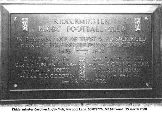 KIDDERMINSTER/ RUGBY FOOTBALL CLUB/ IN REMEBRANCE OF THOSE WHO SACRIFICED/ THEIR LIVES DURING THE SECOND WORLD WAR/ 1939 - 1945/ (9 NAMES)