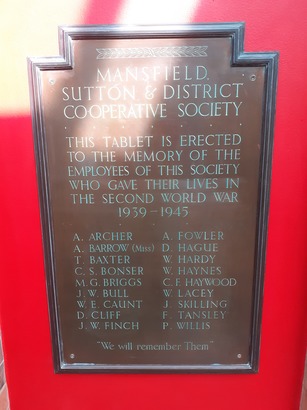 Mansfield, Sutton & District Cooperative Society This tablet is erected to the memory of the employees of this society who gave their liv4s in the second world war 1939 - 1945 (names) "We will remember them"