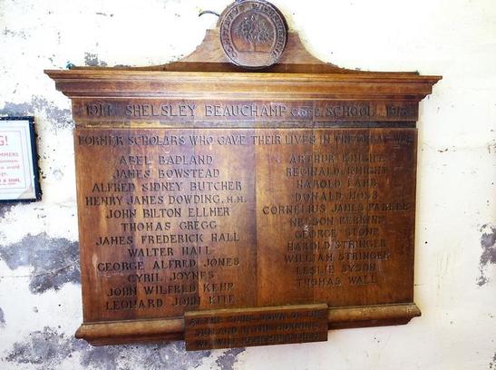 1914 SHELSLEY BEAUCHAMP C.OF.E. SCHOOL 1918/FORMER SCHOLARS WHO GAVE THEIR LIVES IN THE GREAT WAR/(names)/AT THE GOING DOWN OF THE SUN/AND IN THE MORNING/WE WILL REMEMBER THEM
