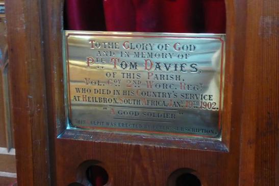 TO THE GLORY OF GOD/ AND IN MEMORY OF / PTE TOM DAVIES/ OF THIS PARISH,/ VOL. COY 2ND WORCS REGT./ WHO DIED IN HIS COUNTRY'S SERVICE / AT HEILBRON, SOUTH AFRICA, JANY 19TH 1902. / "A GOOD SOLDIER" / THIS PULPIT WAS ERECTED BY PUBLIC SUBSCRIPTION
