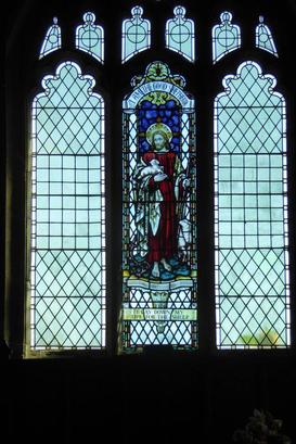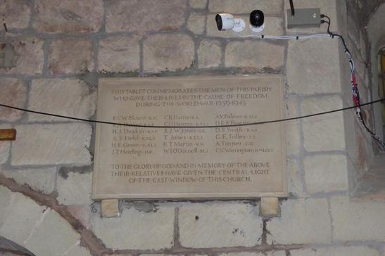 Tablet: THIS TABLET COMMEMORATES THE MEN OF THIS PARISH/ WHO GAVE THEIR LIVES IN THE CAUSE OF FREEDOM/ DURING THE WORLD WAR 1939 - 1945/ (Names)/ TO THE GLORY OF GOD AND IN MEMORY OF THE ABOVE/ THEIR RELATIVES HAVE GIVEN THE CENTRAL LIGHT/ OF THE EAST WINDOW OF THIS CHURCH. Window: I AM THE GOOD SHEPHERD/ I LAY DOWN MY/ LIFE FOR THE SHEEP