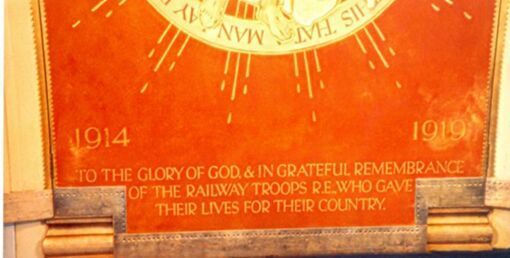 IHS/ GREATER LOVE HATH NO MAN THAN THIS THAT A MAN LAY DOWN HIS LIFE FOR HIS FRIENDS/ I AM HE THAT LIVETH AND WAS DEAD AND/ BEHOLD I AM ALIVE FOR EVERMORE/ 1914 1919/ TO THE GLORY OF GOD & IN GRATEFUL REMEMBRANCE/ OF THE RAILWAY TROOPS R.E., WHO GAVE/ THEIR LIVES FOR THEIR COUNTRY.