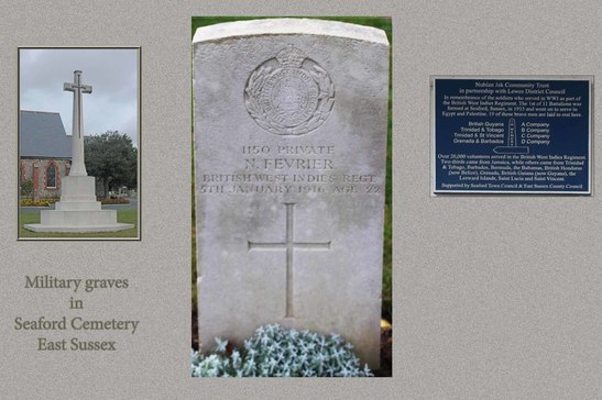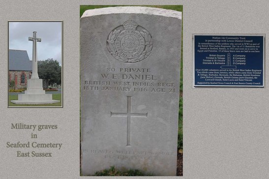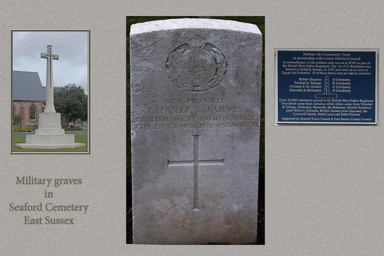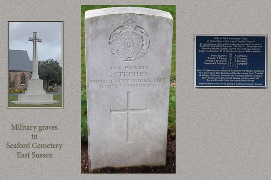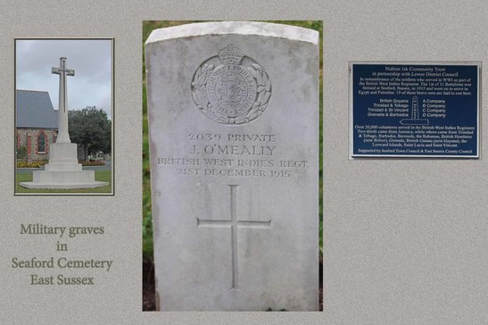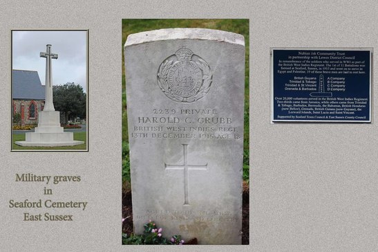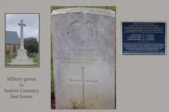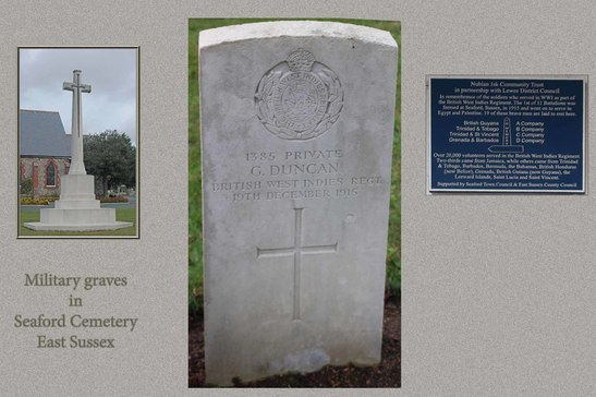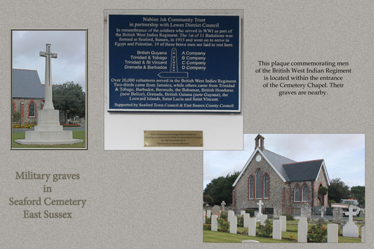 /In remembrance of the soldiers who served in WW1 as part of / the British West Indies Regiment. The 1st of 11 Battalions was / formed at Seaford, Sussex, in 1915 and went on to serve in / Egypt and Palestine. 19 of these brave men are laid to rest here. / IN MEMORY / British Guyana A Company / Trinidad & Tobago B Company / Trinidad & St Vincent C Company / Grenada & Barbados D Company / Over 20,000 volunteers served in the British West Indies Regiment. / Two-thirds came from Jamaica, while others came from Trinidad / & Tobago, Barbados, Bermuda, the Bahamas, British Honduras / (now Belize), Grenada, British Guiana ( now Guyana), the / Leeward Islands, Saint Lucia and Saint Vincent. /