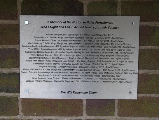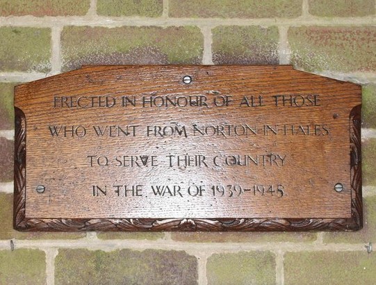 Erected in memory of all those/who went from Norton-in-Hales/to serve their country/in the war of 1939-1945. Second plaque records the names of those who died in both wars: In memory of the Norton in Hales parishioners/who fought and fell in armed service for their country/names/we will remember them.