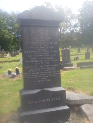 .../ALSO PTE WILLIAM WILSON 49657/THE BELOVED SON OF THE ABOVE/4TH COMPAMY, 13TH CHESHIRE REGT/WHO WAS KILLED IN ACTION JANY 22ND 1917/AND WAS INTERRED AT BERKS CEMETERY EXTENSION/PLOEGSTEERT WOOD, NORTH OF ARMENTIERES/FRANCE/IN HIS 22ND YEAR
